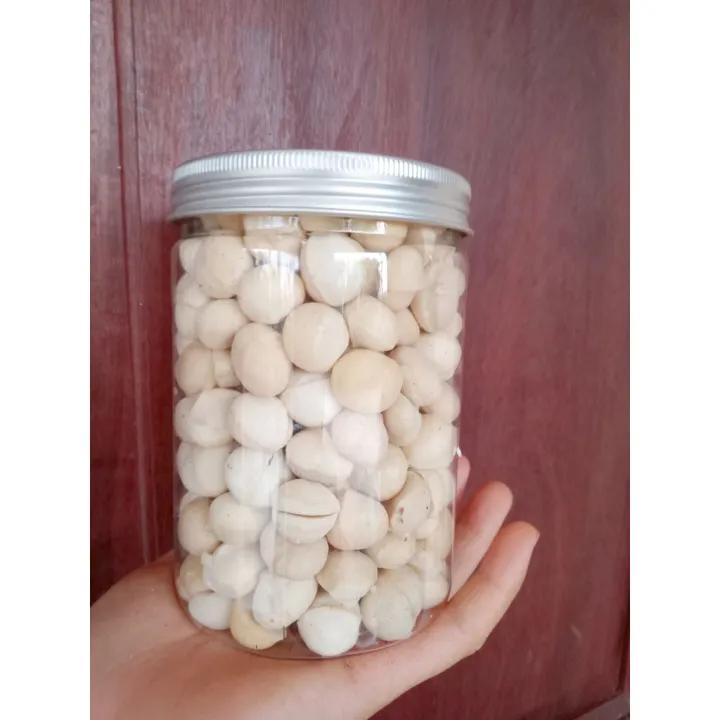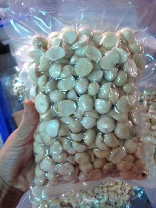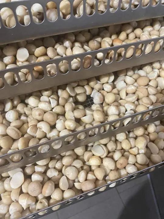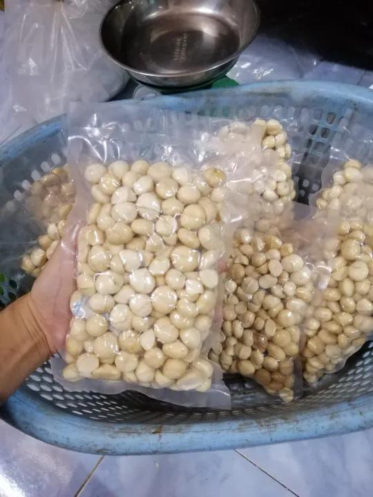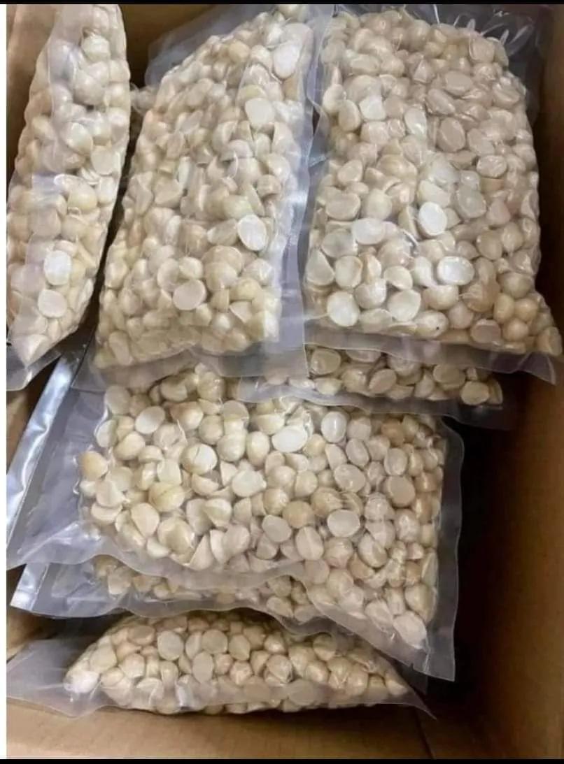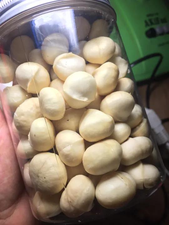 Macca nhân trắng đã được tách vỏ nâu, sấy dẻo. Nhân macca này có thể vận chuyển xa vì đã được sấy.